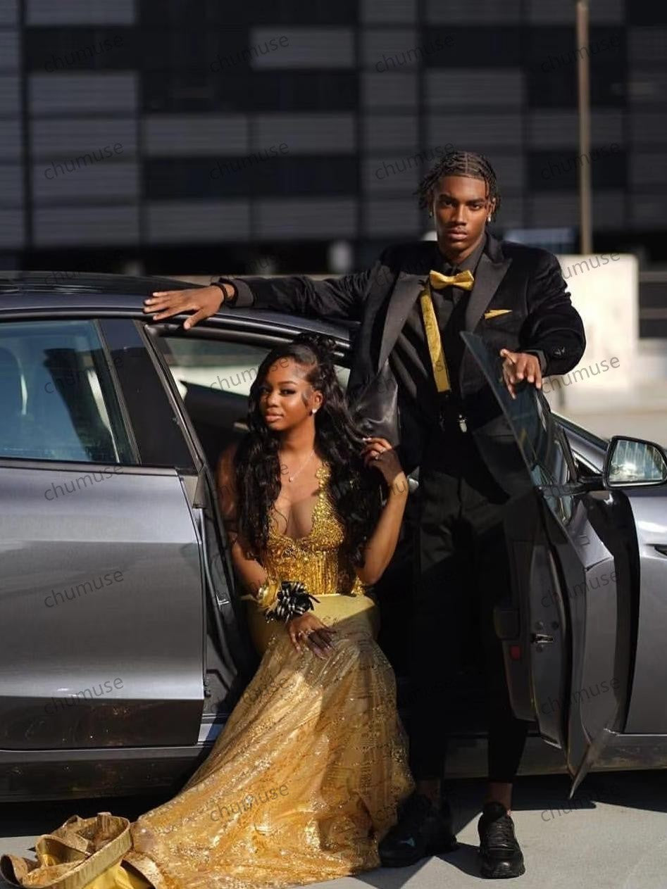فستان حورية البحر لحفلات أعياد الميلاد الرسمية للفتيات ذوات البشرة السوداء، مرصع بالألماس الذهبي اللامع، مزين بالكريستال اللامع