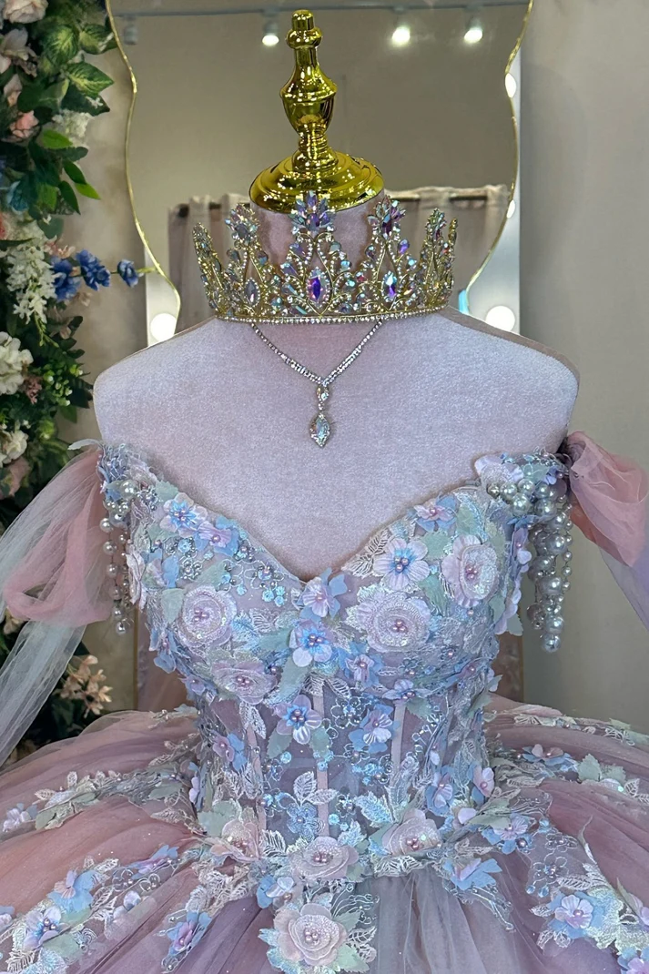 This elegant pink quinceañera dress features an off-shoulder, sleeveless design that highlights the neckline with grace. Adorned with delicate beading and intricate 3D flower appliques, it offers a textured, sophisticated look. Perfectly tailored for a Sweet 15 celebration, this gown combines romantic details with expert craftsmanship to create a memorable and refined appearance.