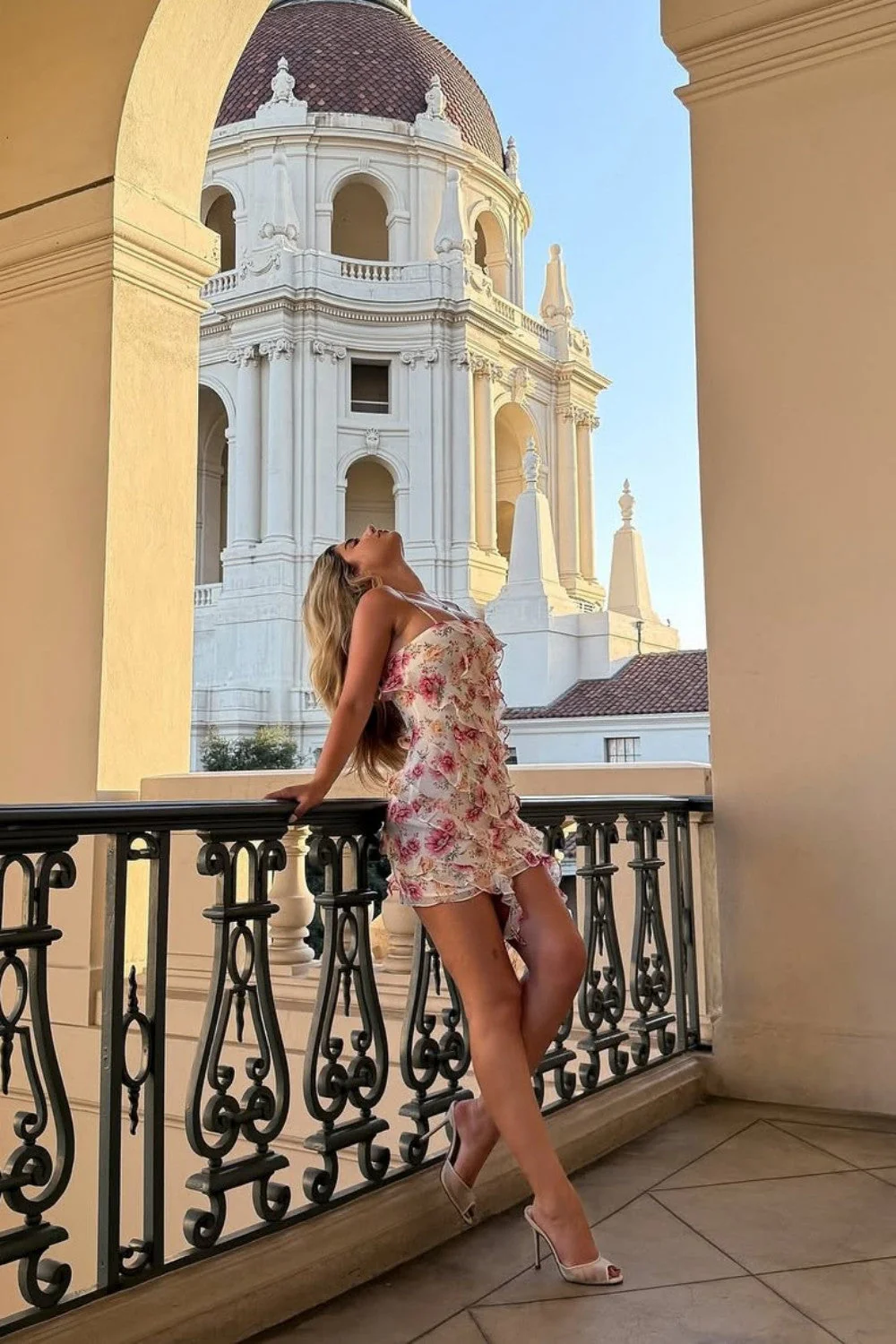 Pink Floral Ruffle Spaghetti Straps Mini Sheath Homecoming Dress
