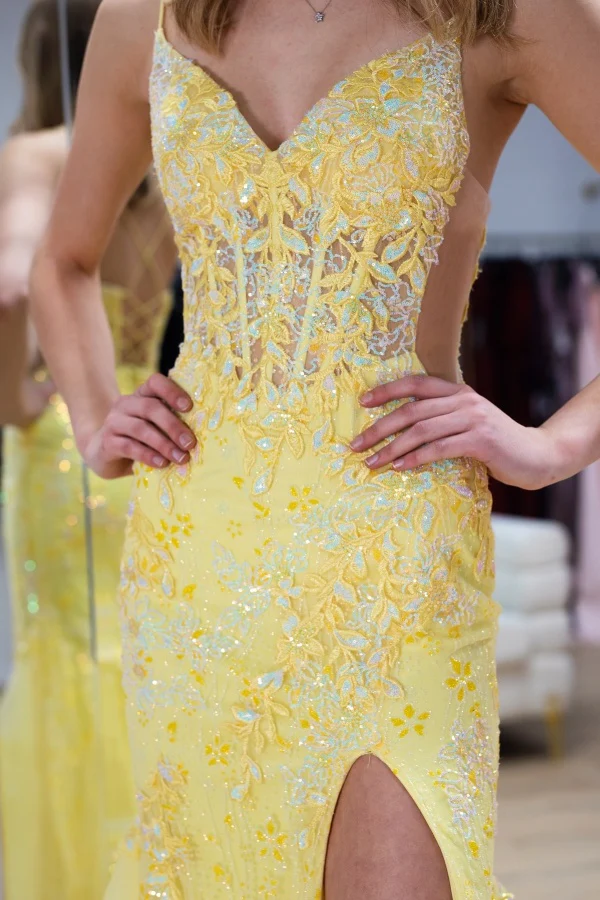 Indulge in luxury with our evening gown. The sheath silhouette accentuates your figure while the V-neck and spaghetti straps add a touch of elegance. Adorned with sequins and delicate appliques, this dress is perfect for a prom or party. A high side slit and train add drama, while the open back adds a hint of allure. Make a statement in this sophisticated and exclusive gown.