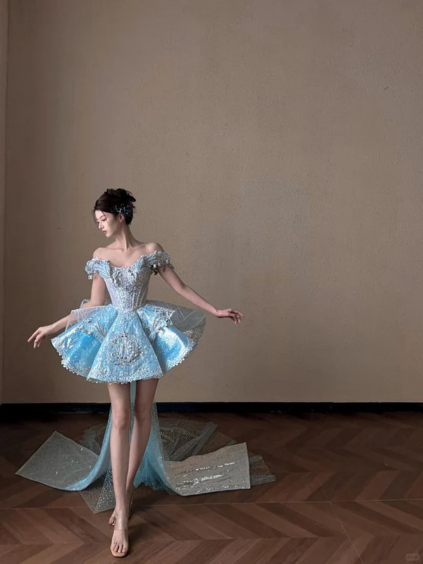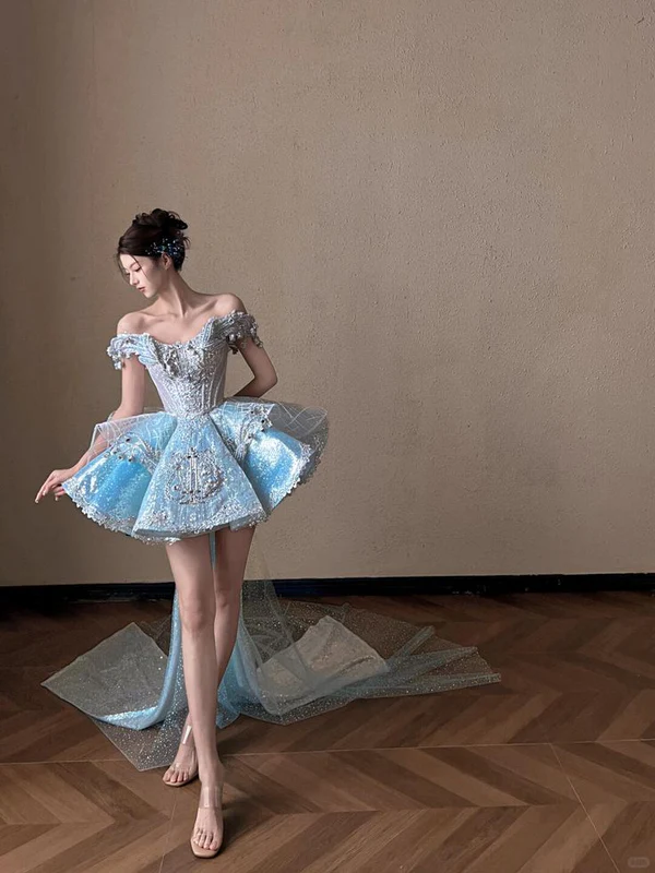 Blue A Line Off the Shoulder Exquisite Beaded Sequin Short Homecoming Dress