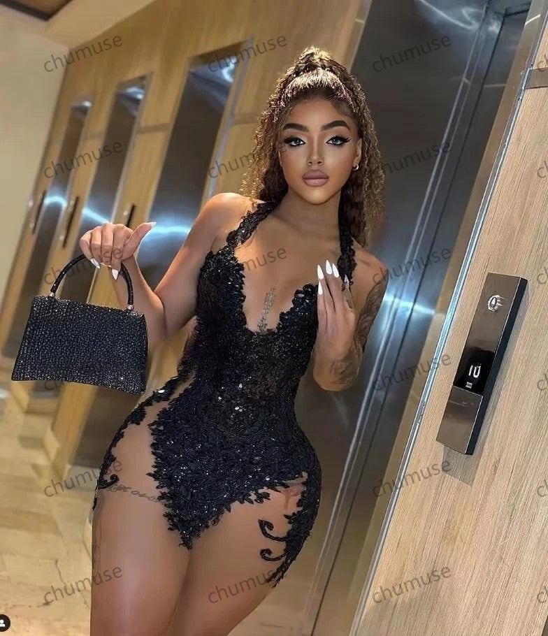 Customized Little Black Dress Sparkly Mini Evening Cocktail Dresse for Black Girl Luxury Gillter Applique Birthday Gala Gown
