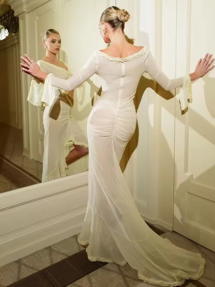 Deep V Neck Sheer Dress For Women Elegant Slim Hollow Out Dress Femme Holiday Beach Sexy Ruffle Slit Evening Dress Ladies