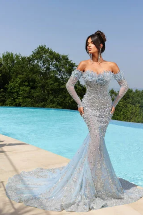 Elegant Bead Embroidery Strapless Sky Blue Vacation Mermaid Prom Dress