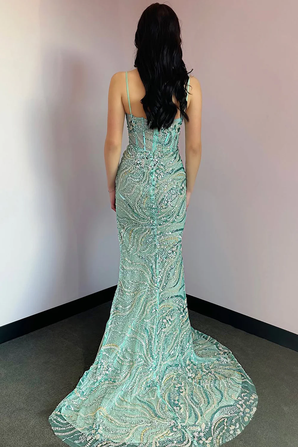 Mermaid V Neck Mint Sequin Lace Long Prom Dresses with Slit